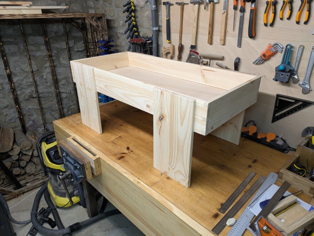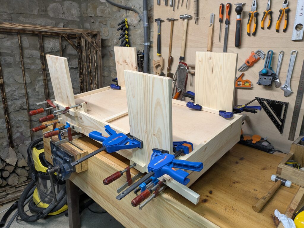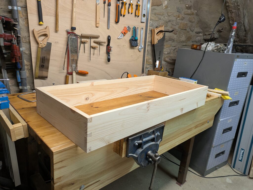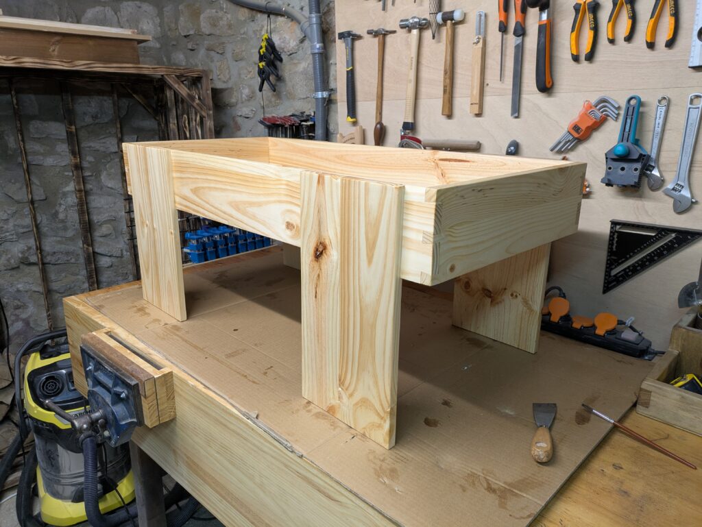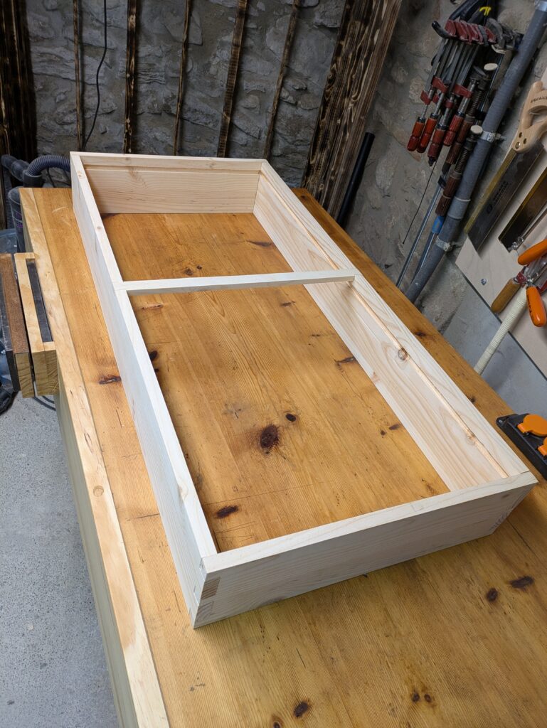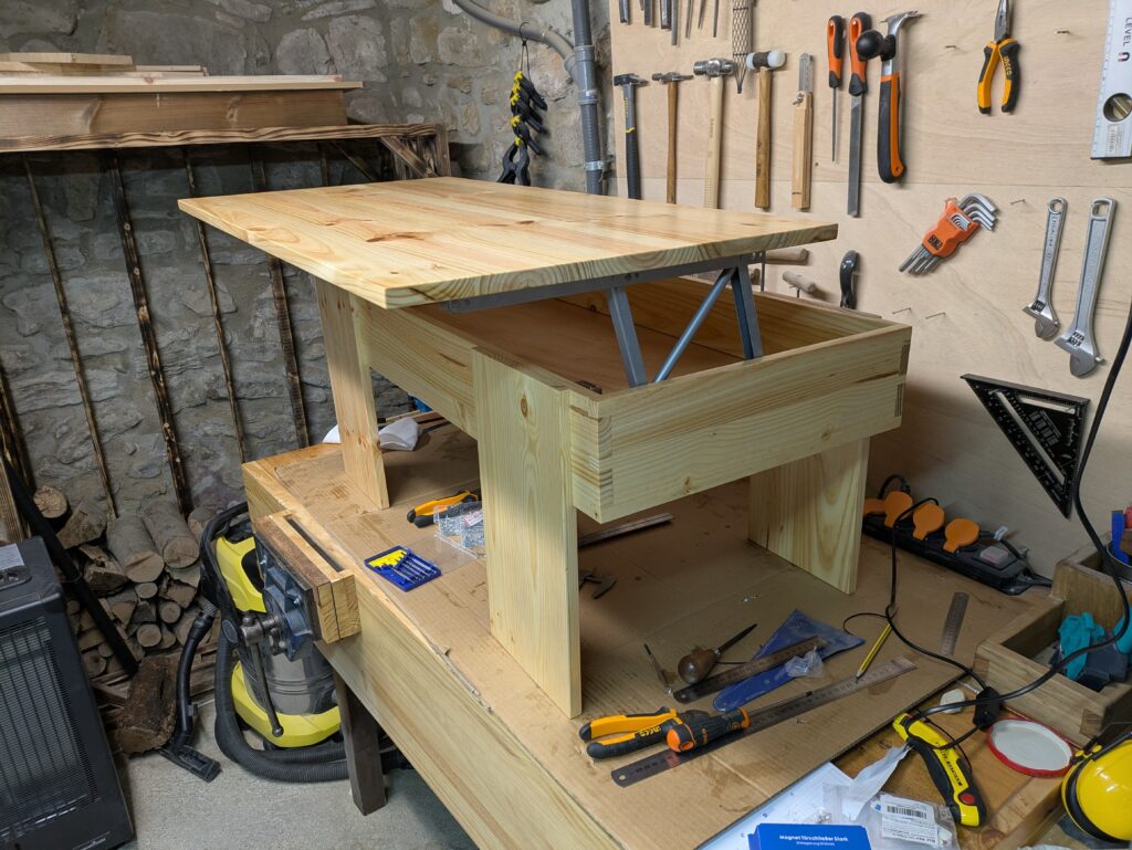 Solid pine coffee table with a lift-top revealing a large storage compartment. Built with exposed dovetail joinery at the corners, wide legs, and rounded edges. Natural satin finish that highlights the wood grain.