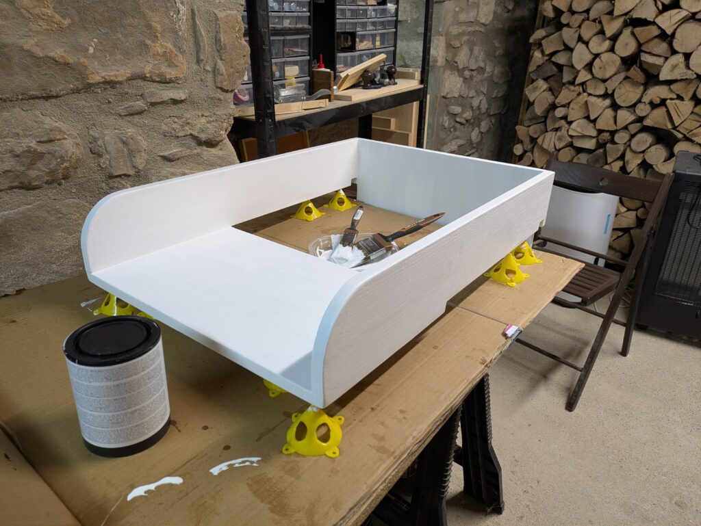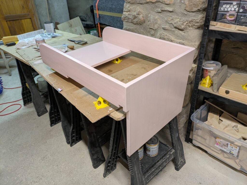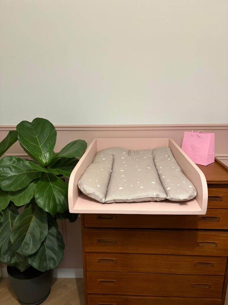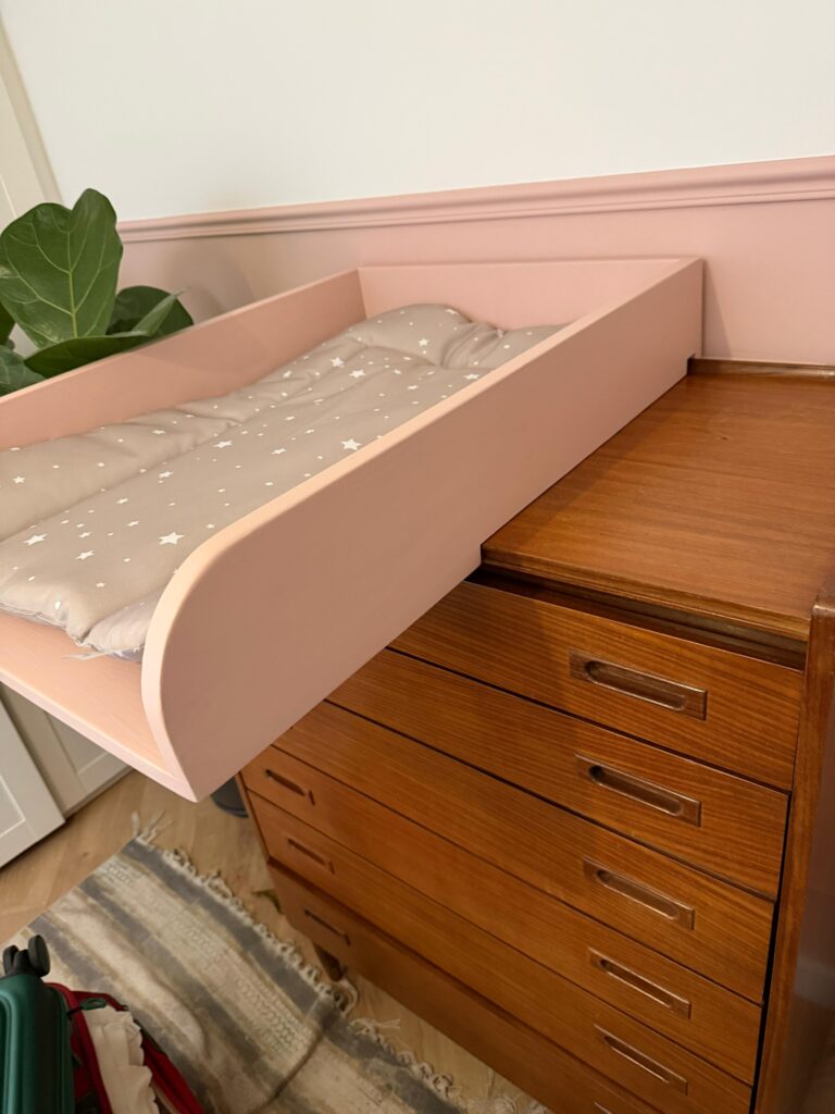 Custom baby changing tray for a vintage dresser, made of wood and painted in soft pink. High sides with a rounded front and smooth edges for added safety; a rear notch so it sits flush against the wall and uses the full surface. Designed for a standard changing pad and easy to remove when not in use.