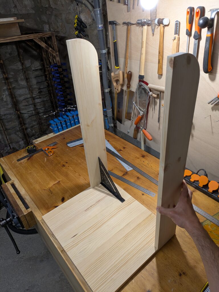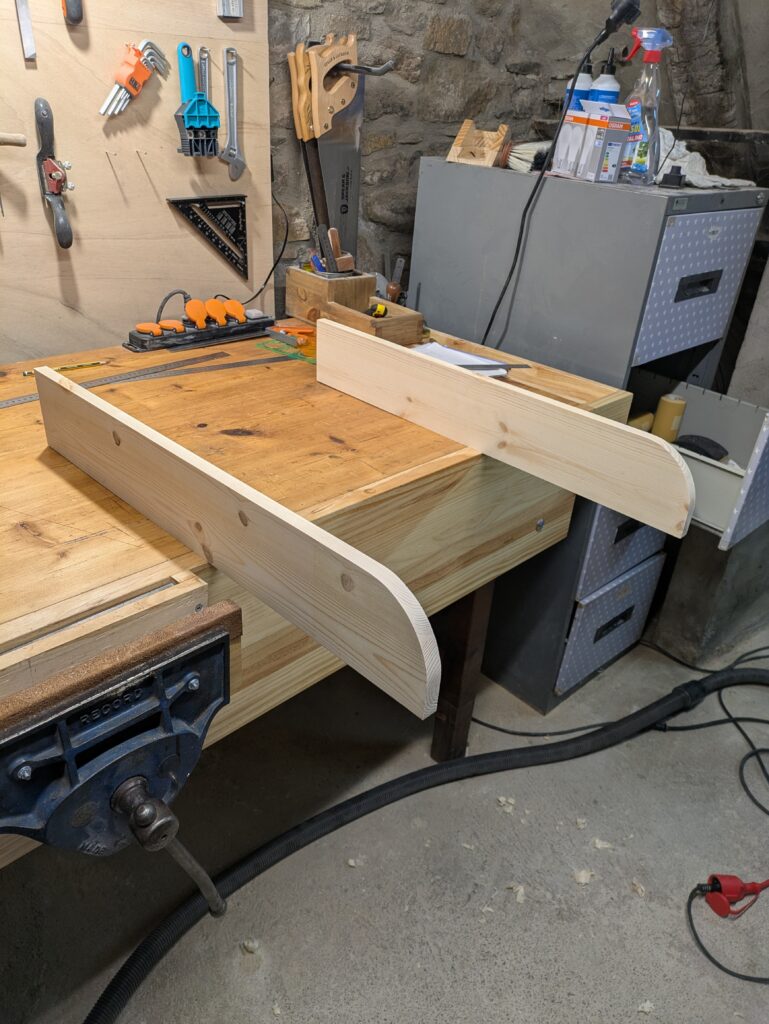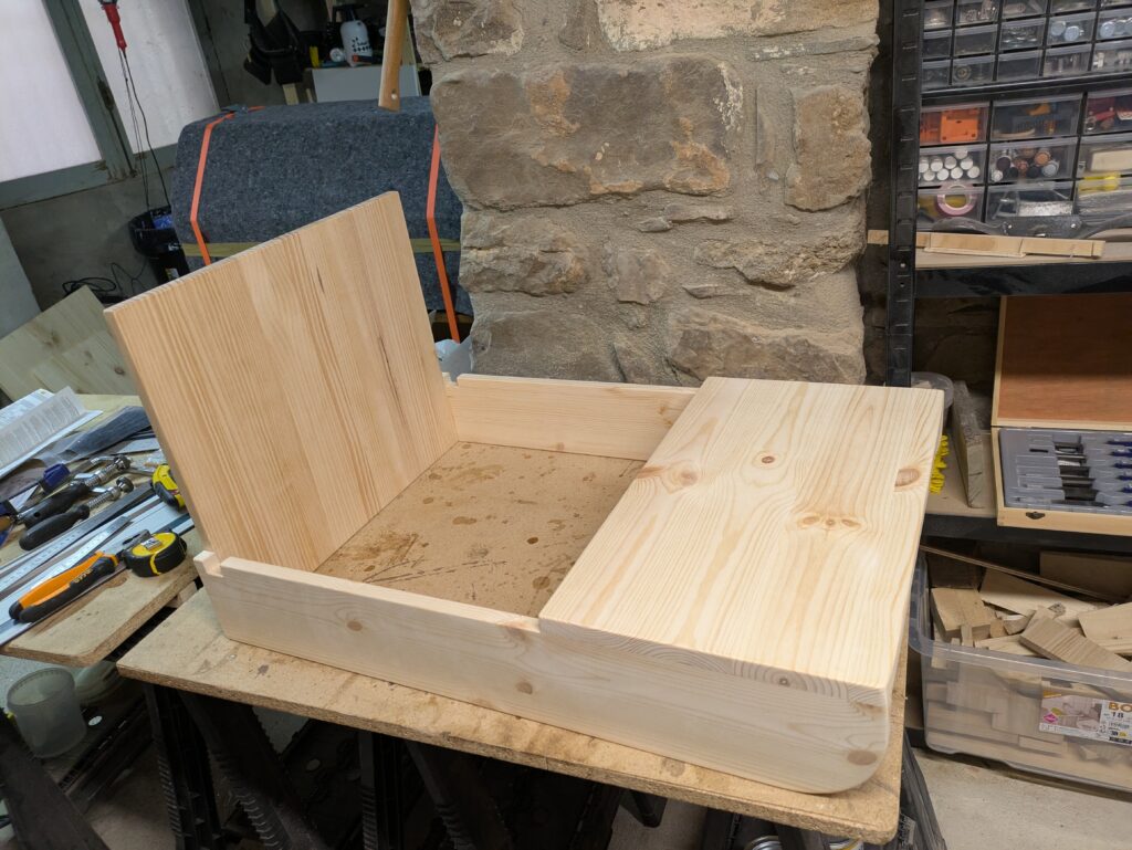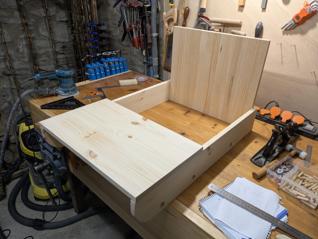 Custom baby changing tray for a vintage dresser, made of wood and painted in soft pink. High sides with a rounded front and smooth edges for added safety; a rear notch so it sits flush against the wall and uses the full surface. Designed for a standard changing pad and easy to remove when not in use.